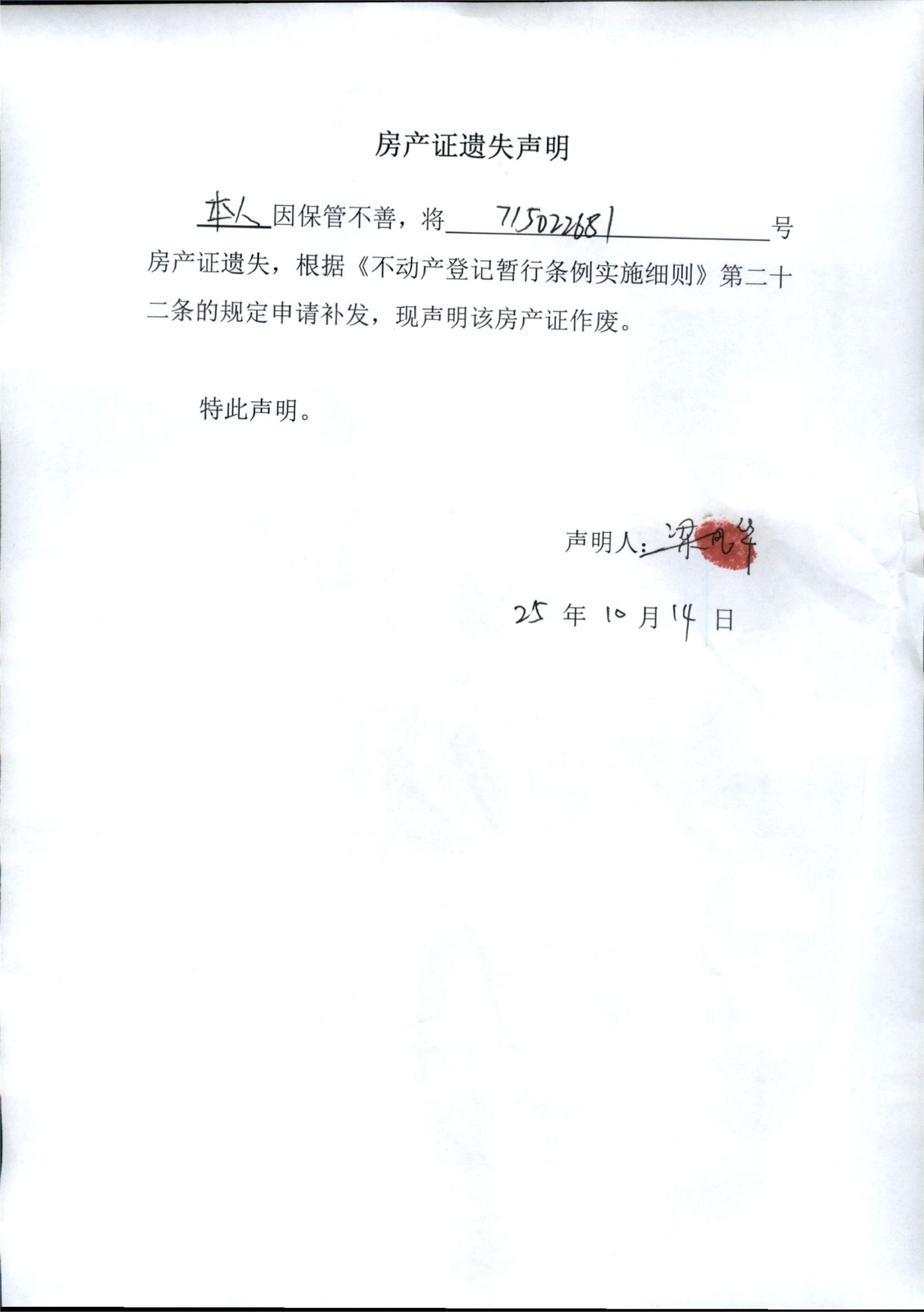 梁凤华 715022681号房产证 怀国用(2015)第出827-167号土地证 遗失