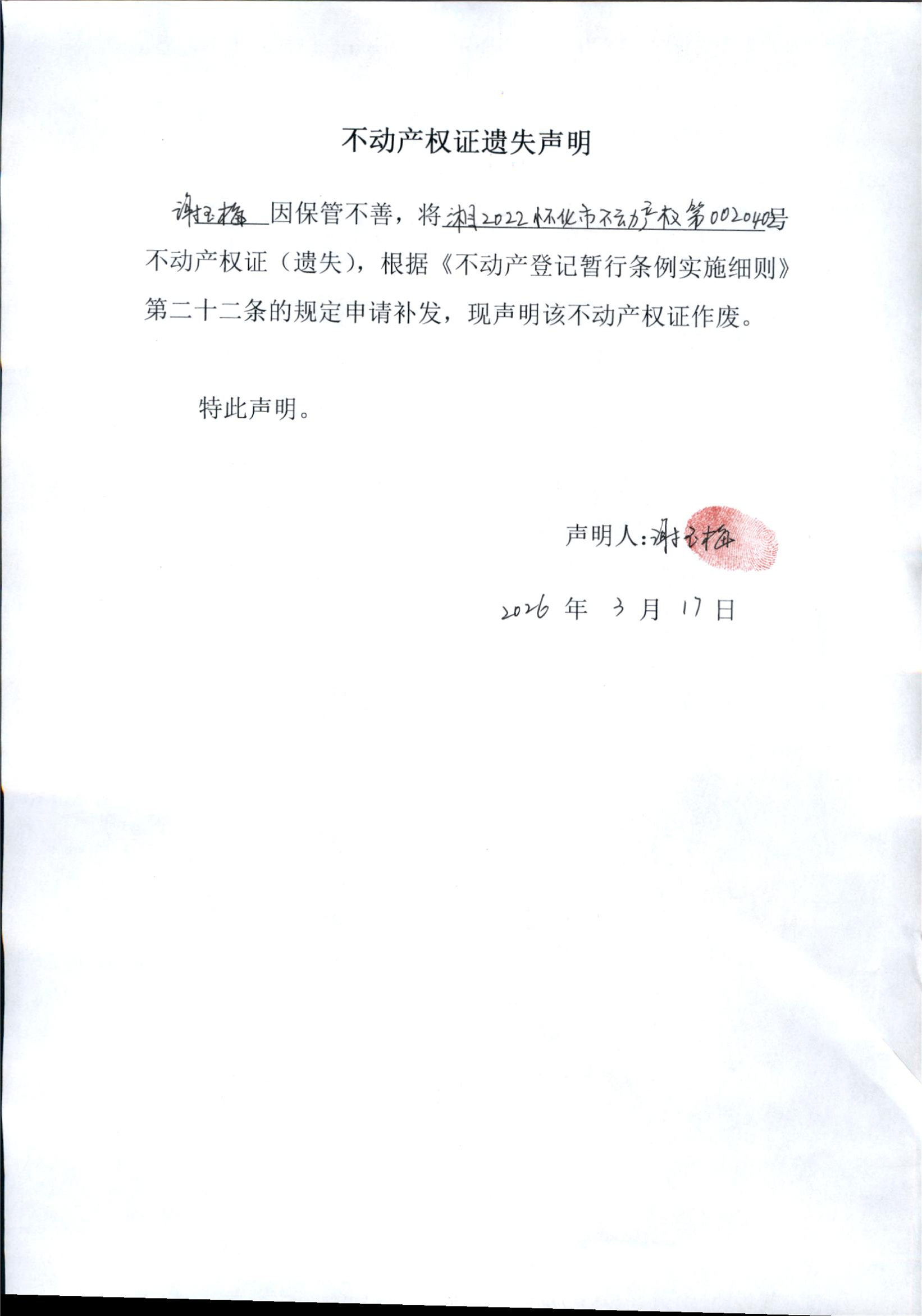 谢玉梅 湘2022怀不动产权第0020402号遗失公告