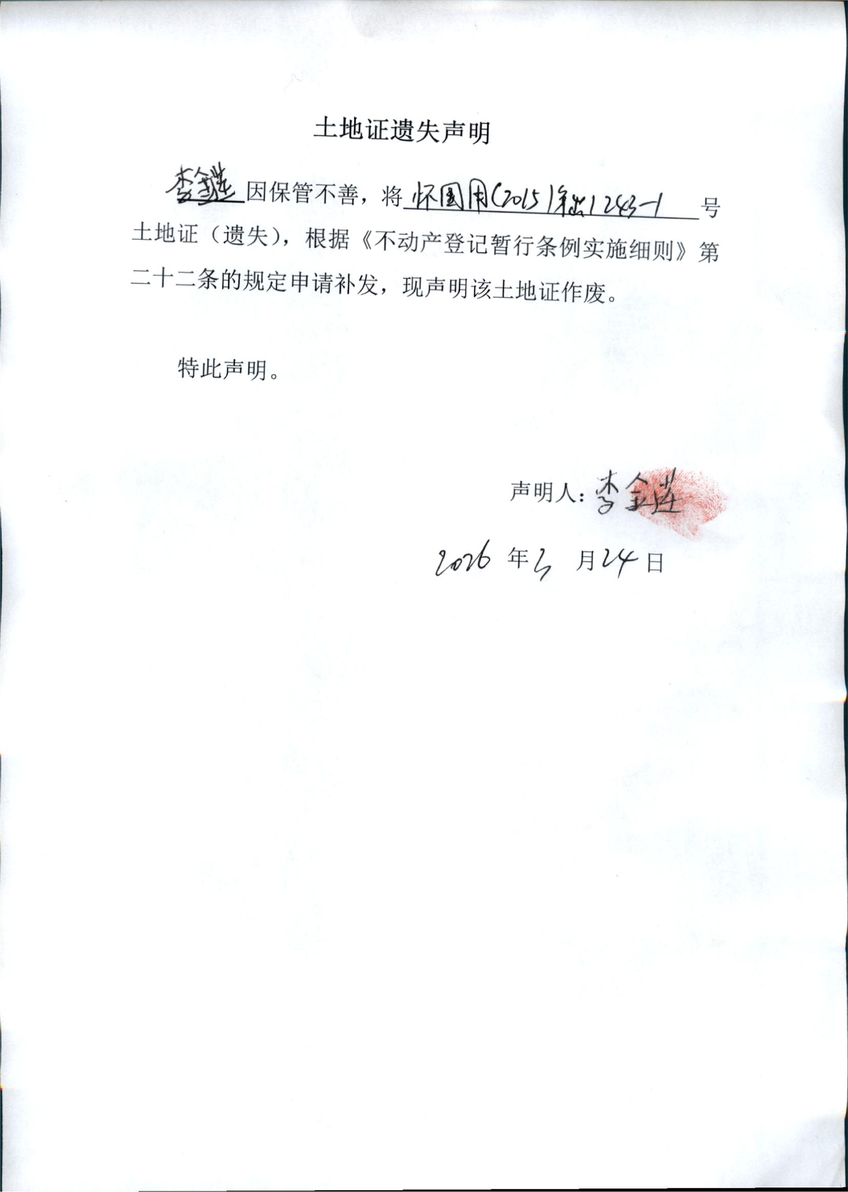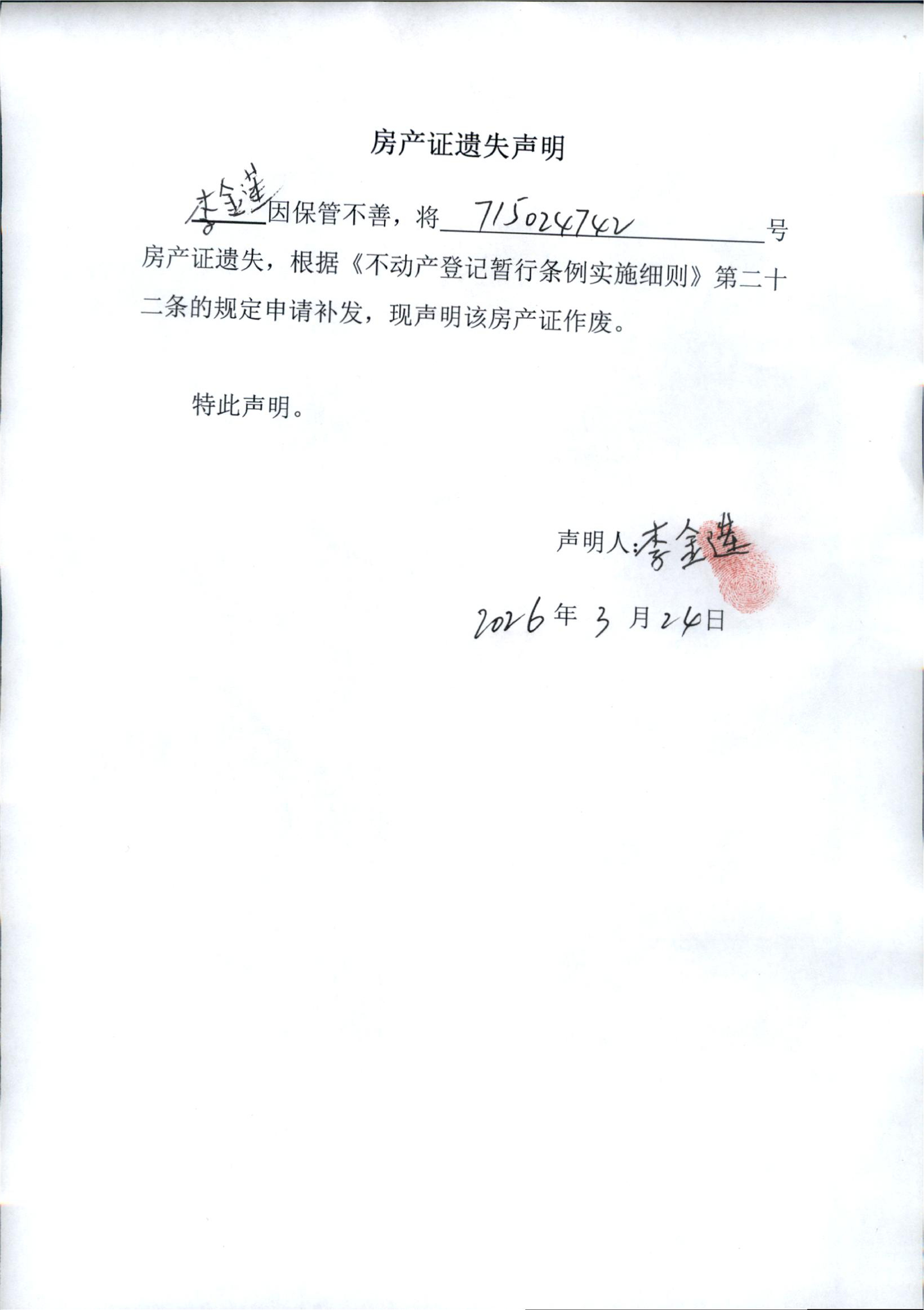 李金莲 715024742号房产证 怀国用(2015)第出1243-1号土地证 遗失