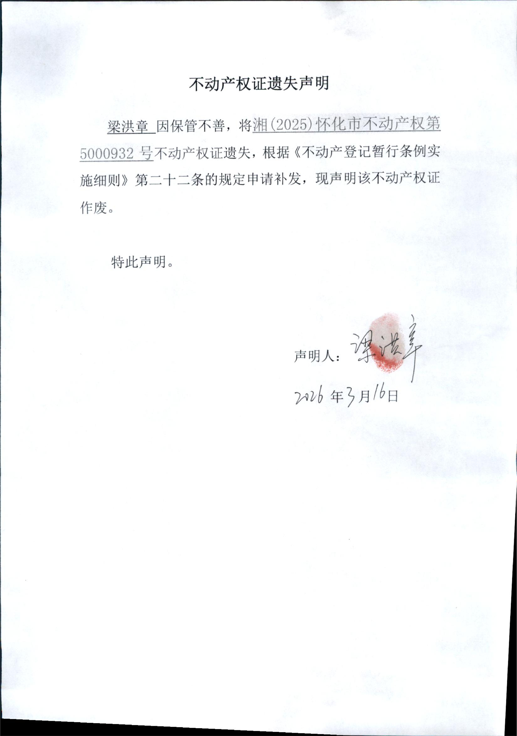 梁洪章湘2025怀化市不动产权第5000932号遗失