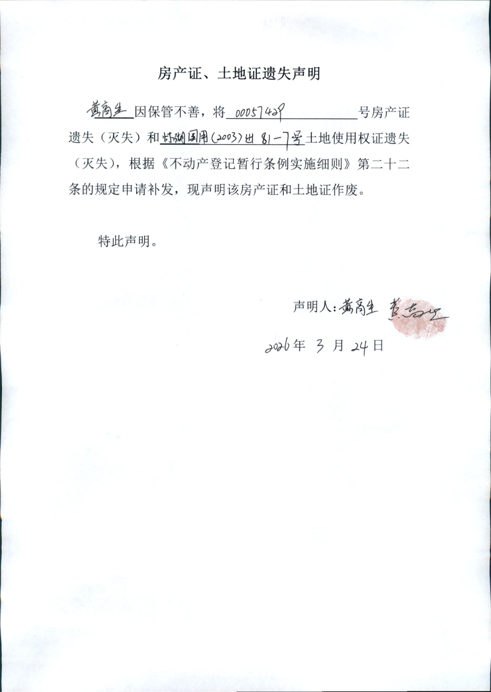 黄高生 怀湖国用2003出81-7号国有土地证、00057429房产证遗失