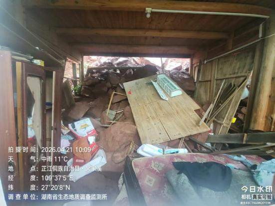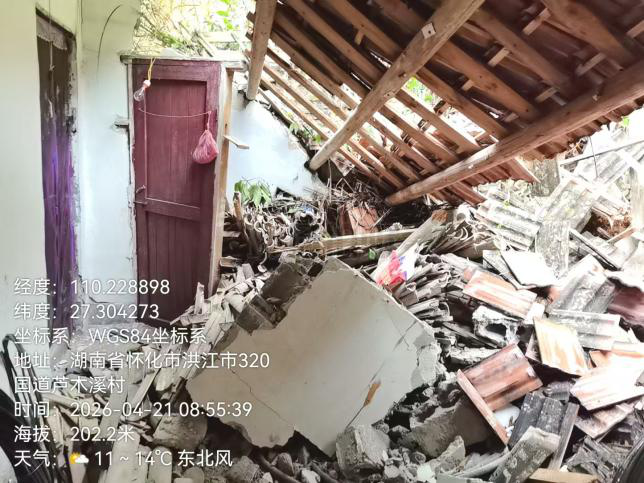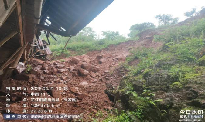 4月20日15时,怀化市洪江市启动地质灾害防御IV级响应,雪峰镇积极响应预警防御,组织值班干部和各村干部下沉一线,对地质灾害点等进行全面巡查和隐患排查。16时,芦木溪村书记杨根林、副书记李勇发现唐田屋后山体开裂,存在滑坡风险,立即上报并将唐田1户4人暂时转移到安全位置。21日2时,山体发生滑坡,约20立方米土石倾泻而下,造成房屋损坏,1户4人成功避险。