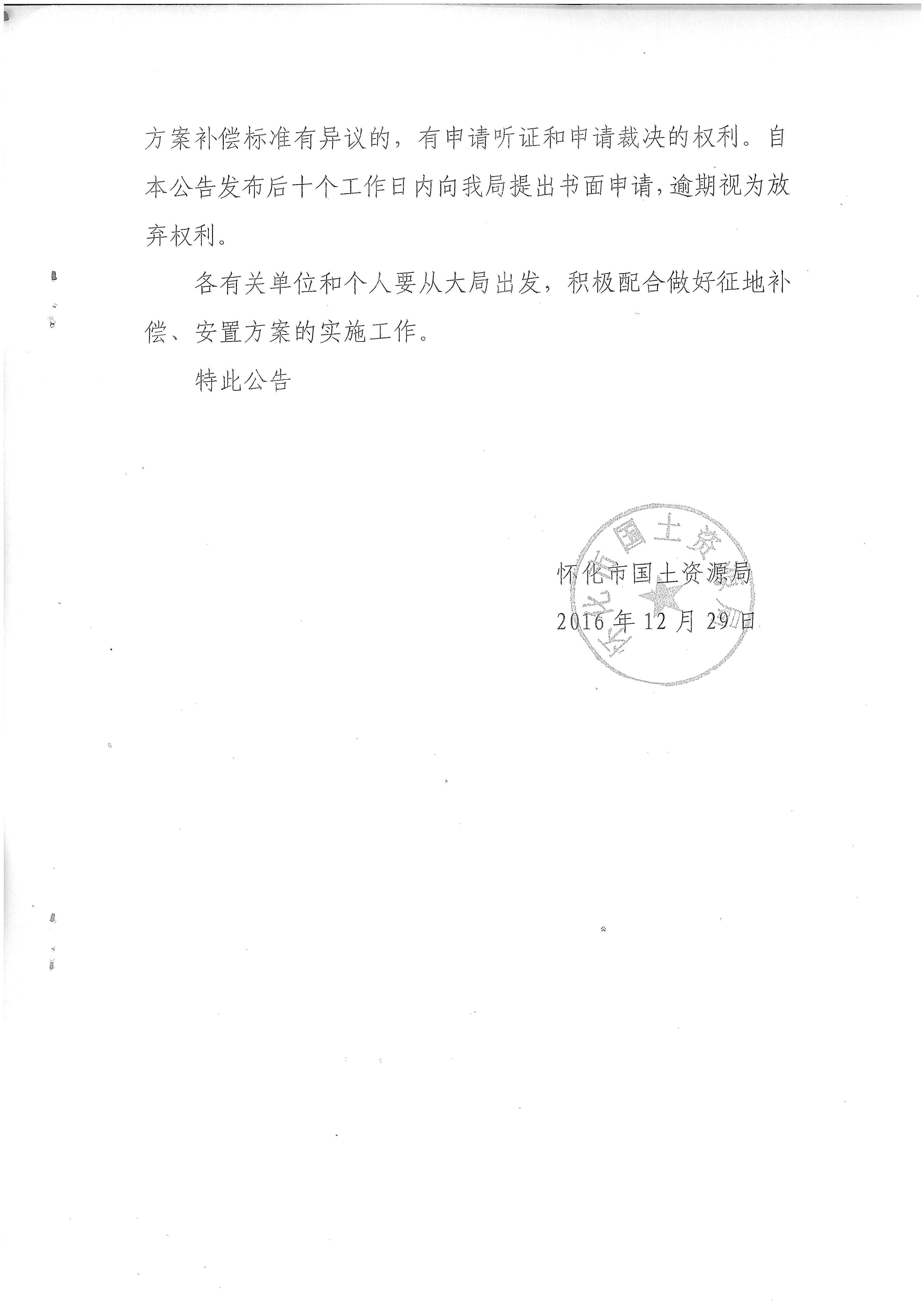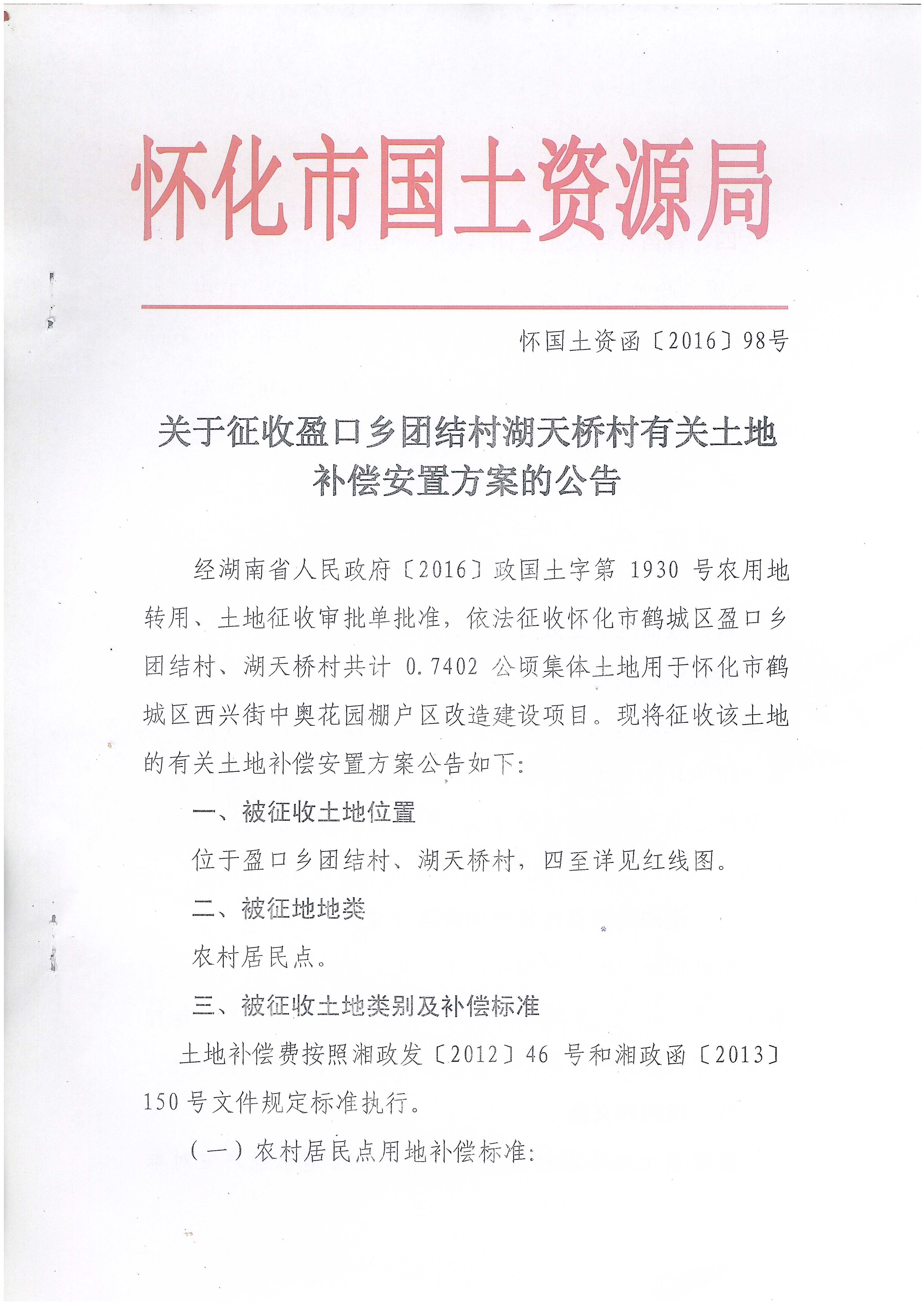 关于征收怀化市鹤城区西兴街中奥花园棚户区改造建设项目有关土地补偿安置方案的公告怀国土资函【2016】98号